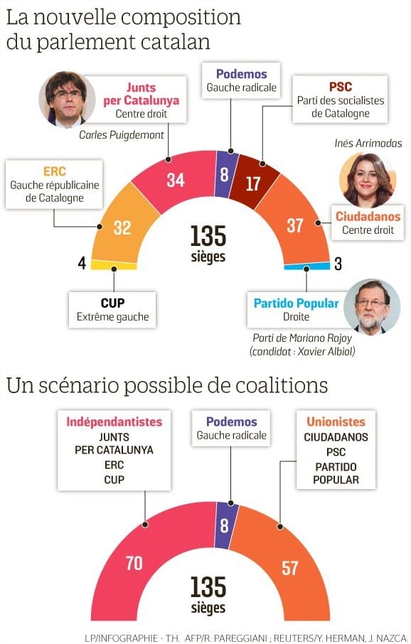 La situation devient un vrai casse-tête en Catalogne : le parti unioniste Ciudadanos (différent du parti de Mariano Rajoy) arrive en tête, et décroche une majorité relative de sièges. Pourtant, la somme des sièges des 3 partis indépendantistes leur donne une majorité absolue.