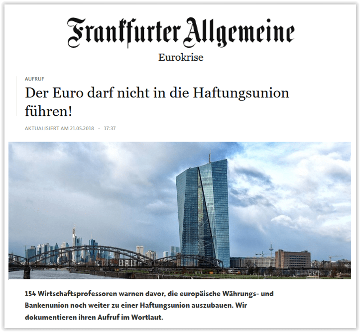 Le 21 mai 2018, ce ne sont pas moins de 154 professeurs d’économie allemands parmi les plus réputés outre-Rhin qui ont jeté un monumental pavé dans la mare en publiant un « appel » – au ton cinglant et sans appel – pour demander au gouvernement de coalition de Mme Merkel de rejeter le plan Macron de réforme de la zone euro et, par la même occasion, d’œuvrer pour qu’une procédure précise de sortie de l’euro soit ajoutée aux traités européens. (Comme le savent les lecteurs des analyses de l’UPR, une telle clause n’existe pas et il est donc impossible pour un État de sortir juridiquement de l’euro sans sortir de l’UE en même temps, par l’article 50 du TUE).