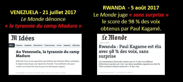 Alors que les médias s’acharnent – sans nuances – à faire passer pour un dictateur le président vénézuélien qui vient de convoquer une Assemblée nationale constituante, ils gardent un silence quasi-complet sur le président du Rwanda, Paul Kagamé, qui vient de se faire réélire avec le score stalinien de 98 % des voix et 97 % de participation…