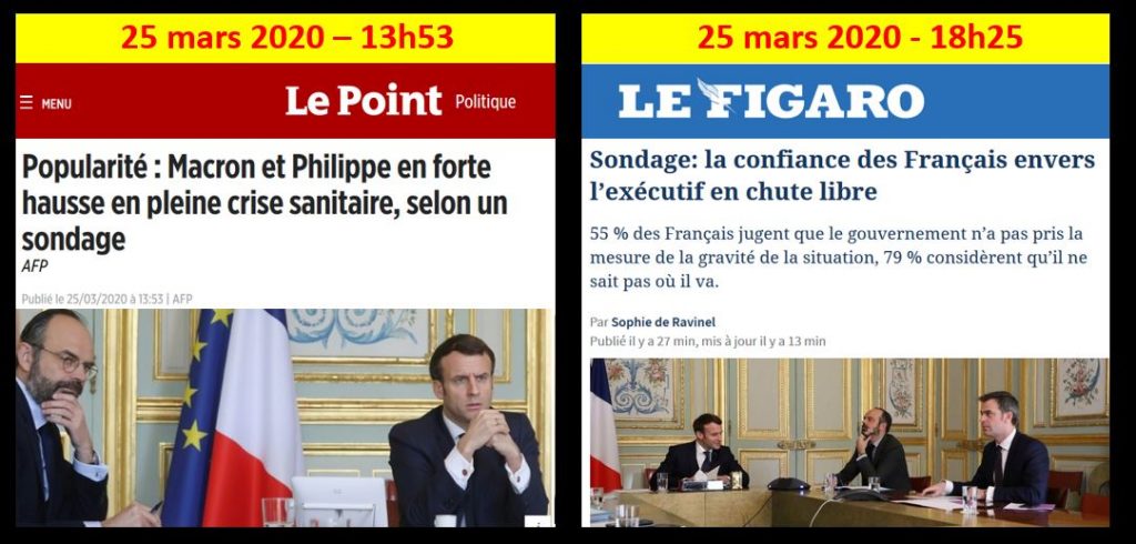 En ce 25 mars 2020, la presse française nous a gratifiés – à quatre heures et trente deux minutes d’intervalle – de deux « sondages » dont les résultats sont particulièrement cocasses à comparer.