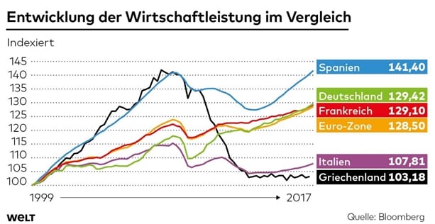 On retrouve dans les critiques des économistes britanniques et américains toujours ce point récurrent : la plupart des États de la zone ont vu leur économie se renforcer depuis 1999, sauf la Grèce et l’Italie qui n’ont eu pratiquement aucune croissance. Source: Infografik Die Welt