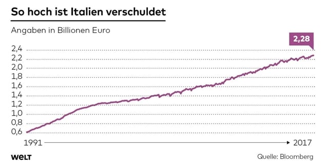 De tous les pays de la zone euro, l’Italie est de loin celui qui a la plus grosse montagne de dettes. Rome doit 2,3 billions d’euros. L’Allemagne, selon l’Office fédéral de la statistique, n’arrive quant à elle qu’à deux billions. Du fait de la taille beaucoup plus grande de son économie et aussi de sa base d’imposition, les dettes de l’Allemagne sont plus faciles à supporter que celles de l’Italie. À quoi s’ajoute le fait que les investisseurs demandent à la botte italienne des intérêts notablement plus élevés, ce qui contribue encore à rendre la dette difficile à supporter. .