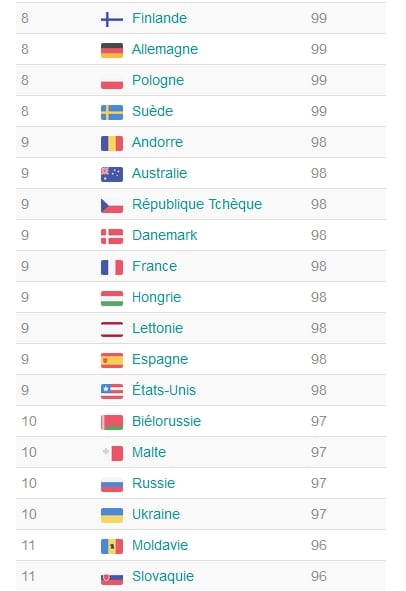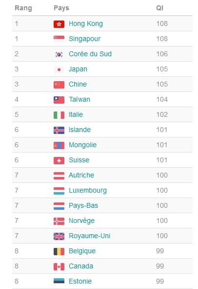 Les résultats de ce travail, qui sont en ligne sur le site IS Reseach – La référence des tests de QI sont les suivants, pour les premiers de la liste, en termes de comparaison mondiale :