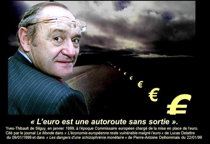 Enfin, cette voie sans retour a toujours été affirmée haut et fort par tous les ténors de l’européisme. Comme je le rappelle dans ma conférence « FAUT-IL AVOIR PEUR DE SORTIR DE L’EURO ?« , Yves-Thibault de Silguy, à l’époque Commissaire européen chargé de la mise en place de la monnaie unique, avait par exemple déclaré en janvier 1999 au journal Le Monde que « l’euro est une autoroute sans sortie ».