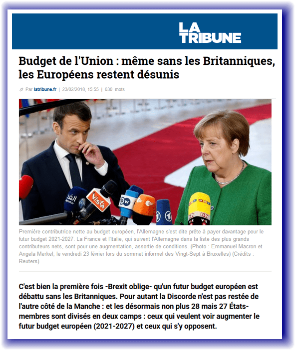 On notera enfin que les Britanniques, qui quitteront l’UE en mars 2019, n’auront plus de « facture très salée » à payer ensuite, à la différence des autres grands pays contributeurs nets qui ont entamé les négociations du futur cadre budgétaire pluriannuel 2021-2027. Si les Français ne sortent pas de l’UE au plus vite et s’ils laissent Macron engager la France dans ce nouveau cadre, ils devront payer une « facture très salée » pendant 7 ans supplémentaires, jusqu’en 2027 !
