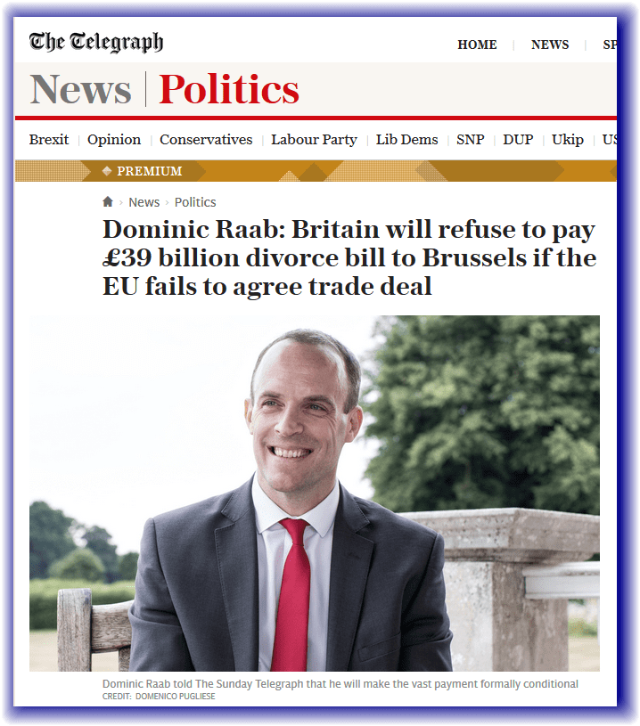 LE BREXIT TOURNE AU BRAS DE FER : Le gouvernement britannique annonce qu’il ne versera pas la « facture de sortie » de 39 milliards £ (43,7 milliards € ) si la Commission européenne n’assouplit pas sa position sur l’accord avec le Royaume-Uni.