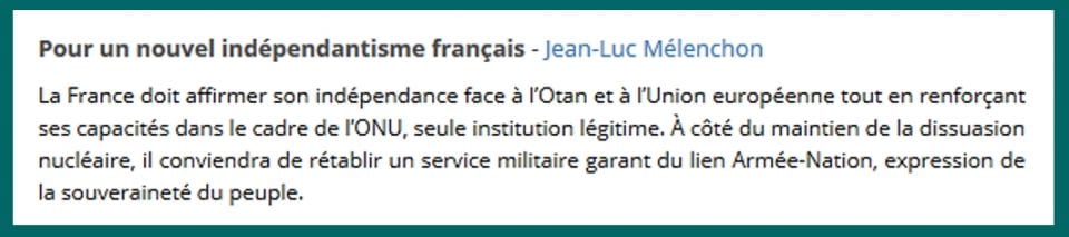 Comme on le voit, Jean-Luc Mélenchon proposait certes « un nouvel indépendantisme français » (le mot « indépendantisme » semblant être forgé pour éviter de parler simplement de l’indépendance, voire pour ridiculiser cette dernière), et affirmait : « la France doit affirmer son indépendance face à l’OTAN et à l’Union européenne ».