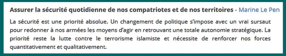 Comme on le voit, Mme Le Pen proclamait bien sûr que « la sécurité est une priorité absolue » et qu’il « faut redonner à nos armées les moyens d’agir en retrouvant une totale autonomie stratégique ».