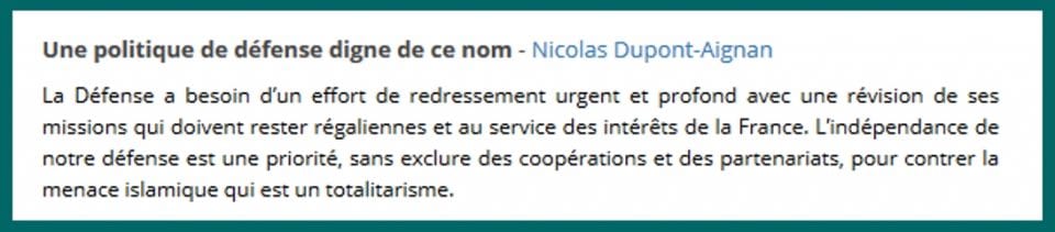 Comme on le voit, Nicolas Dupont-Aignan proclamait certes que « l’indépendance de notre Défense est une priorité ».