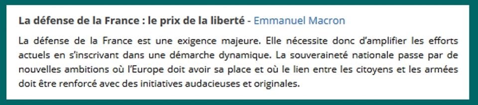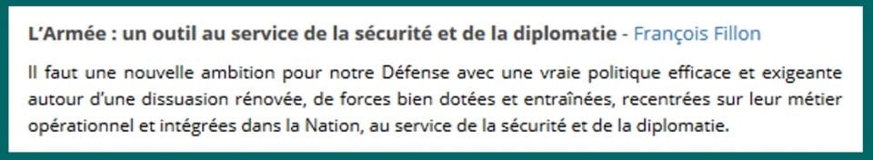 Comme on le voit, François Fillon accumulait – comme Macron mais en un peu moins caricatural -, les vœux pieux et les formules ronflantes : « nouvelle ambition », « vraie politique efficace et exigeante », « dissuasion rénovée », « forces bien dotées et entraînées recentrées sur leur métier opérationnel et intégrées dans la Nation »…