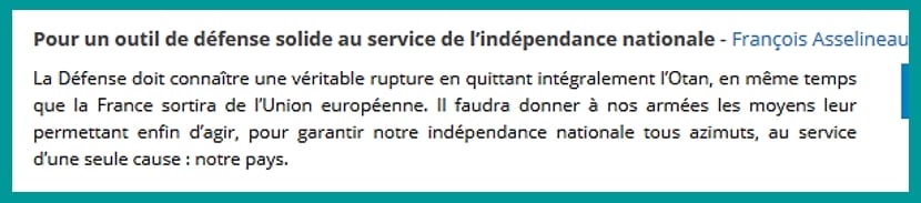 Comme on le voit François Asselineau a bien été le seul des candidats ayant répondu à la Revue de Défense nationale à proposer de sortir de l’UE et de l’Otan. Il n’y avait aucune ambiguïté, aucun propos à double sens, en un mot aucune tromperie.