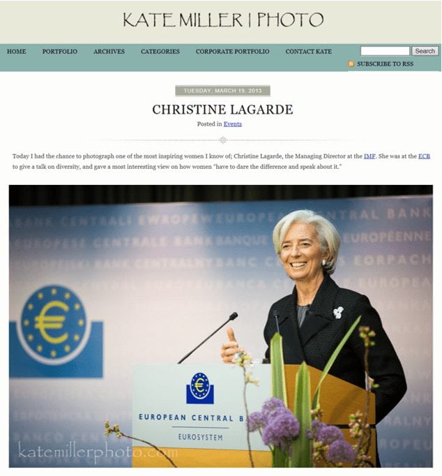 Traduction : « J’ai eu aujourd’hui la chance de photographier l’une des femmes les plus inspirantes dont j’ai entendu parler ; Christine Lagarde, qui dirige le FMI. Elle était venue à la BCE pour donner un discours sur la diversité et a donné un point de vue des plus intéressants sur comment les femmes doivent oser assumer leur différence et en parler ».
