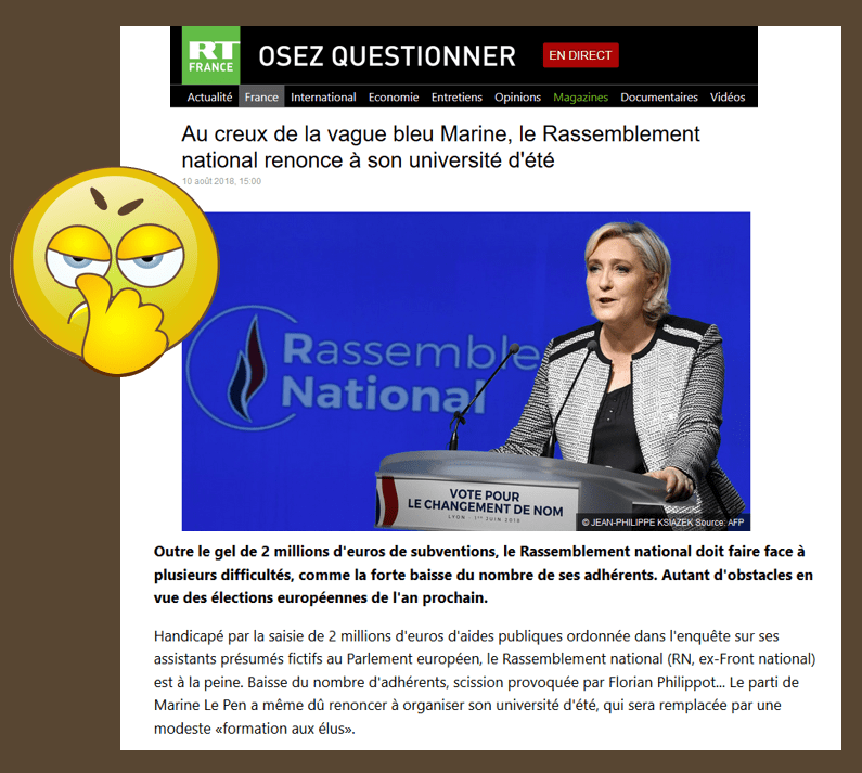 - que le Front national (rebaptisé RN), aux abois financièrement et sous le coup d’une enquête pour détournements de fonds et avec la saisie de 2 millions d’euros de subventions, a annoncé qu’il n’organisera pas d’université d’été cette année et qu’il ne compterait plus que 31 000 adhérents (source ici )