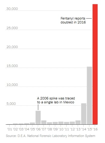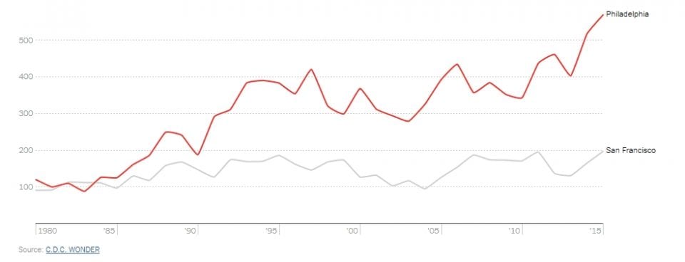 Bien que les données soient préliminaires, la meilleure estimation du Times est que les décès ont augmenté de 19% par rapport aux 52 404 enregistrés en 2015. Et toutes les preuves indiquent que le problème a continué à s’aggraver en 2017.