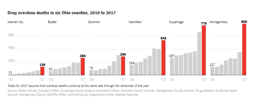 Les données initiales indiquent une forte augmentation des décès par surdose de drogue dans les États situés le long de la côte Est, en particulier le Maryland, la Floride, la Pennsylvanie et le Maine. Dans l’Ohio, qui a déposé une plainte la semaine dernière accusant cinq compagnies pharmaceutiques d’encourager l’épidémie d’opiacés, nous estimons que les décès liés à une surdose ont augmenté de plus de 25% en 2016.