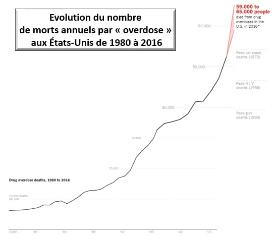 Le grand quotidien new-yorkais révèle en effet qu’il y a eu, en 2016, plus de 59 000 morts par « overdose » aux États-Unis, soit… plus que le nombre total d’Américains morts pendant les 19 ans de la guerre du Vietnam ! Ce qui est encore plus grave, c’est que ce nombre de morts augmente d’année en année de façon quasiment exponentielle, comme le montrent les graphiques illustrant cette enquête.