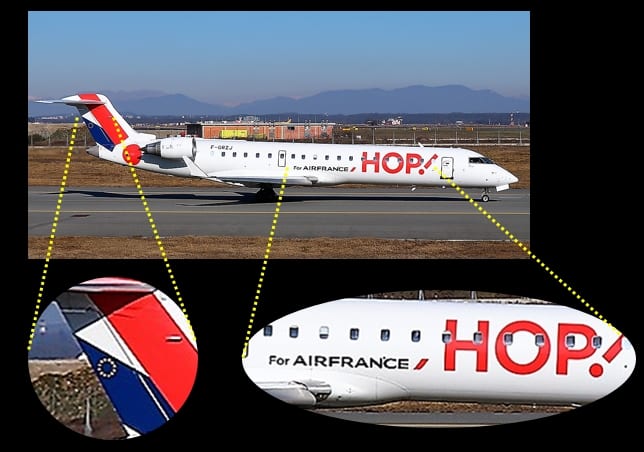 Il n’est pas anodin non plus de noter que cette évolution se retrouve aussi sur la livrée de la compagnie aérienne « HOP ! », également filiale d’Air France. Créée le , « HOP ! » résulte de la fusion des trois anciennes filiales régionales d’Air France : Brit Air, Régional et Airlinair. HOP !, qui opère des vols quotidiens vers plus d’une centaine de destinations françaises et européennes, présente une décoration en langue anglaise « FOR AIR FRANCE » et avec le drapeau européen sur l’empennage arrière :