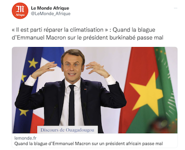 – Autre exemple, lorsque, devant les étudiants de l’université de Ouagadougou, il a tourné en dérision de façon humiliante le président Kaboré du Burkina Faso : «Il est parti réparer la climatisation» comme s’il s’agissait d’un domestique fautif ! (nov.2017)