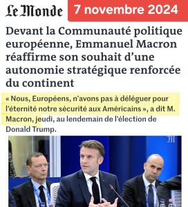 Cette situation fait ressortir l’immensité du déni de réalité et de la manipulation de Macron lorsqu’il annonce, à longueur de discours (comme le 7 novembre 2024 : cf. photo)