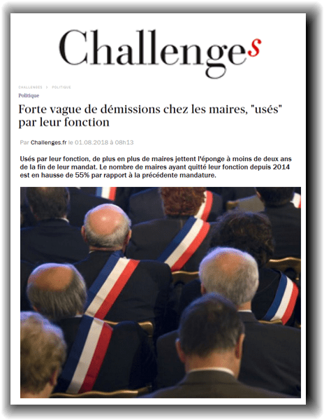 Le gouvernement assiste en effet à une vague sans précédent de démissions de maires : usés par leur fonction, le nombre de maires ayant quitté leur fonction depuis 2014 est en hausse de 55 % par rapport à la précédente mandature !