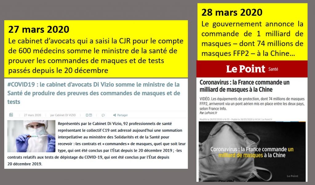 ⚠️ COMMENTAIRE : En informant ce jour la presse que l’État vient de commander 1 milliard de masques et que ceux-ci vont être acheminés par un pont aérien, le gouvernement, sous la pression des avocats, fait donc un terrible aveu : il donne à penser qu’aucune commande de masques n’a été effectuée entre le 3 et le 28 mars !