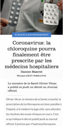 Source : https://www.20minutes.fr/societe/2748835-20200326-coronavirus-gouvernement-autorise-prescription-hydroxychloroquine-contre-covid-19-encadre-vente