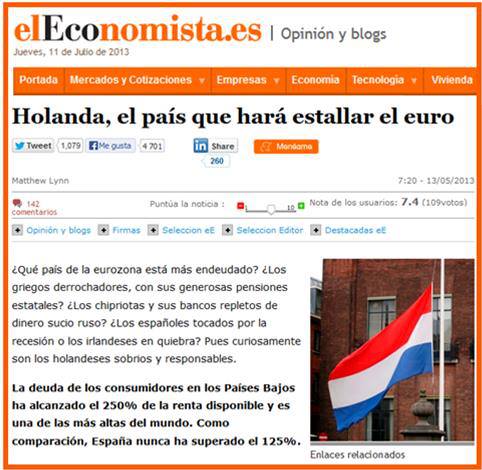 Cet article assurément intéressant est disponible en version originale ici : http://www.eleconomista.es/opinion-blogs/noticias/4819350/05/13/Holanda-El-paIs-que-harA-estallar-el-euro-.html