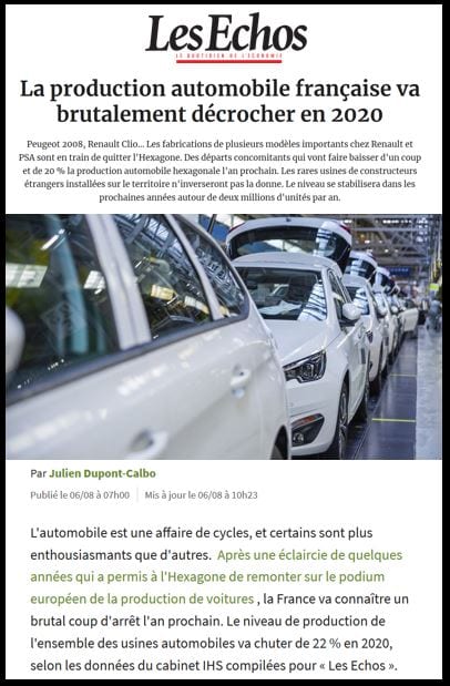 Profitant donc de l’absence prévisible de réactions de l’opinion publique, apathie confortée par le silence des grands médias, le journal « Les Échos » a choisi la date du 6 août pour informer ses lecteurs que le secteur automobile français a décidé une nouvelle avalanche de délocalisations industrielles (données recensées par le cabinet IHS ; Source : https://www.lesechos.fr/industrie-services/automobile/la-production-automobile-francaise-va-brutalement-decrocher-en-2020-1122459)
