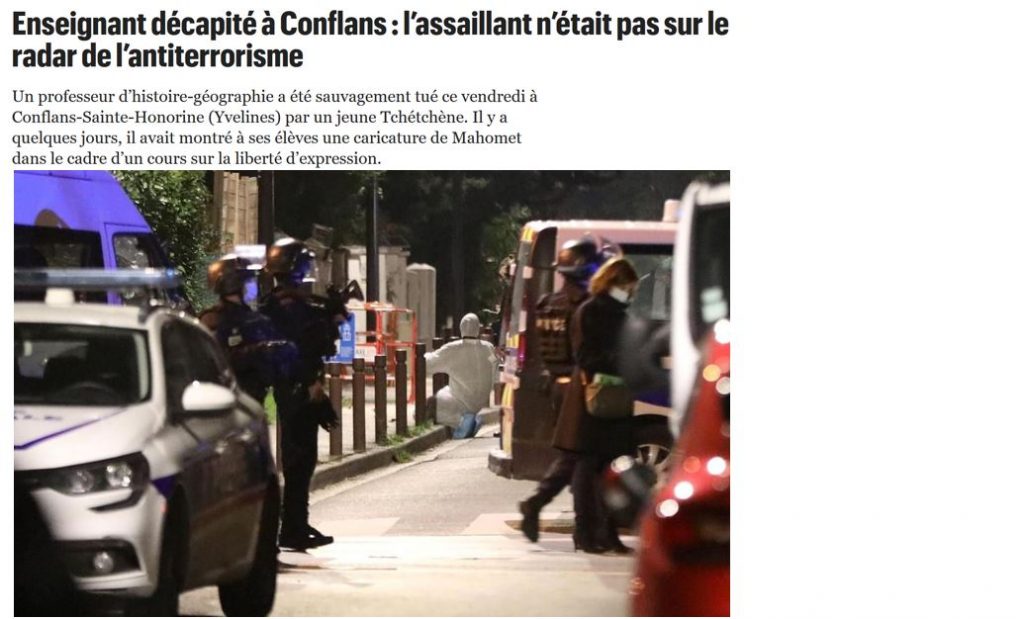 Dans l’après-midi du 6 octobre 2020, un professeur d’histoire-géographie a été décapité à Conflans-Sainte-Honorine (Yvelines). L’assassin présumé, un jeune musulman d’origine tchétchène, a été abattu par la police.