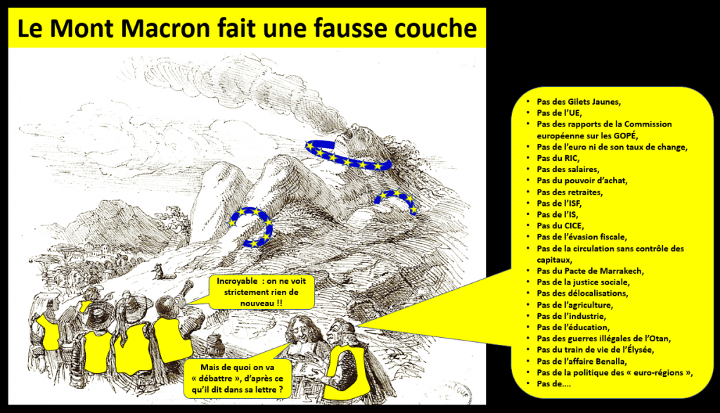 Alors que les Gilets jaunes manifestent en France depuis deux mois, que la mobilisation s’amplifie depuis le début janvier et que 60 à 75% des Français soutiennent ce mouvement (d’après les sondages), le locataire de l’Élysée vient enfin de publier la « Lettre aux Français » qu’il avait annoncée.