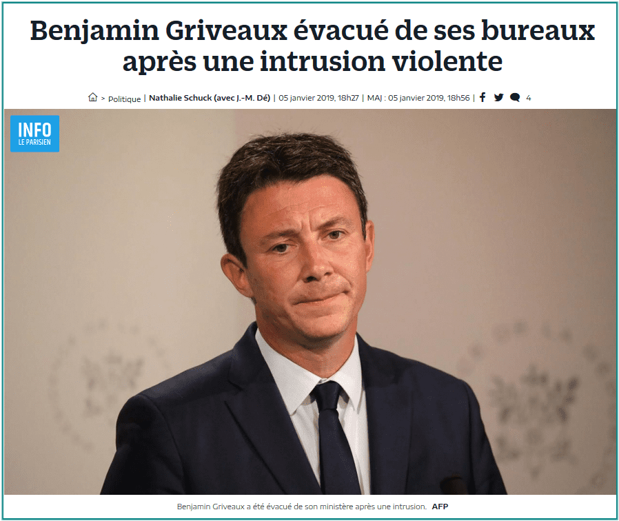 Des tentatives d’intrusion ont également eu lieu dans d’autres ministères.(Source : http://www.leparisien.fr/politique/benjamin-griveaux-evacue-de-ses-bureaux-apres-une-intrusion-violente-05-01-2019-7981473.php )