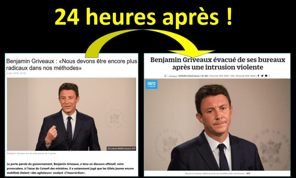 J’ai souligné hier le caractère ahurissant des propos du porte-parole du gouvernement, Benjamin Griveaux. Connu pour son arrogance, cet ancien strauss-kahnien a cru approprié de lancer, à l’issue du Conseil des ministres, un discours dont la véhémence, sinon la provocation, a sidéré les journalistes. Il a notamment jugé que les Gilets jaunes encore mobilisés étaient « des agitateurs » voulant « l’insurrection » et a affirmé d’un air bravache : « Nous devons être encore plus radicaux dans nos méthodes » ! (Source : https://upr.fr/actualite/france/tous-les-elements-se-mettent-en-place-pour-une-explosion-generale-dans-les-mois-qui-viennent/