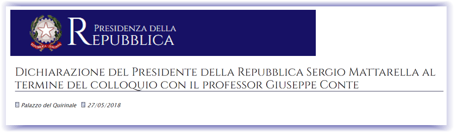 DÉCLARATION DU PRÉSIDENT DE LA RÉPUBLIQUE SERGIO MATTARELLA À L’ISSUE DE SA RENCONTRE AVEC LE PROFESSEUR GIUSEPPE CONTEPalais du Quirinal, 27 mai 2018