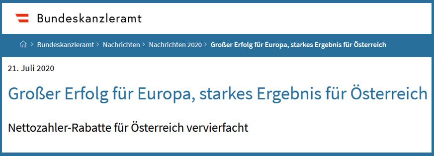 La ministre [autrichienne] de l’Europe Karoline Edtstadler, satisfaite de l’accord des chefs d’État et de gouvernement lors du sommet spécial de l’UE à Bruxelles, a fait cette déclaration mardi 21 juillet 2020 : « Grâce au chancelier Sebastian Kurz, le résultat des négociations sur le cadre financier pluriannuel et le plan de reconstruction de l’Union européenne porte une forte signature autrichienne et est impressionnant. C’est un succès important pour l’Europe et pour l’Autriche. Cela montre une fois de plus qu’il est possible de faire vivre la solidarité européenne et en même temps de protéger les intérêts autrichiens ».