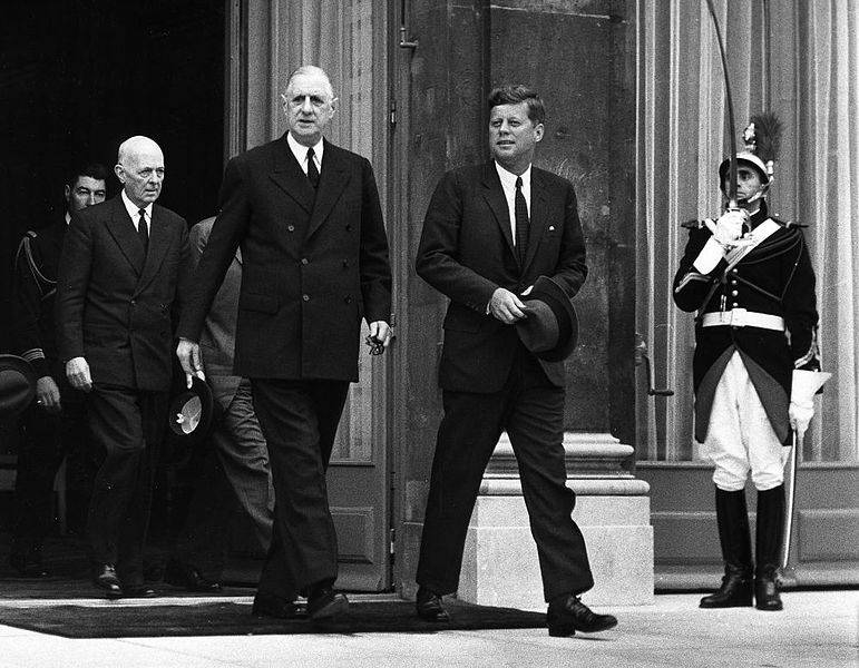 2 juin 1961 : le président John Fitzgerald Kennedy est reçu en visite officielle en France. Cette photo, prise sur le perron de l’Élysée côté jardin, montre l’ascendant pris par Charles de Gaulle sur le président américain, qui tient gauchement son chapeau et qui allonge le pas pour suivre son illustre interlocuteur.