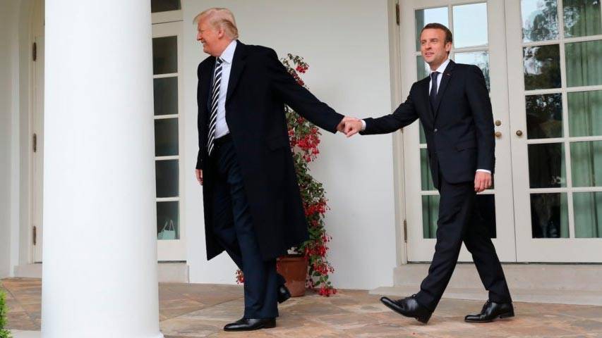 24V avril 2018 : sur le perron de la Maison Blanche, le président Donald Trump tire par la main Emmanuel Macron, qui se laisse conduire passivement comme une marionnette somnambulique, sans aucune volonté ni dignité.