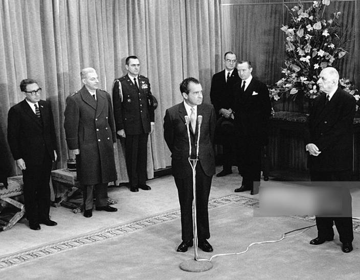 31 décembre 1968 : dans le salon d’honneur de l’aéroport d’Orly, le président Richard Nixon se tient comme un petit garçon timide, les mains dans le dos, en prenant la parole devant Charles de Gaulle. On note, à l’extrême gauche de la photo, la présence de Henry Kissinger, Secrétaire d’État, qui se tient les mains sur la couture du pantalon.