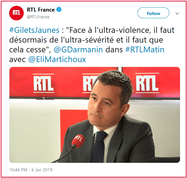 Commentant » l’acte 8 des Gilets jaunes » (manifestations du 5 janvier), il a indiqué que, » Face à l’ultra-violence, il faut désormais de l’ultra-sévérité et il faut que cela cesse « .