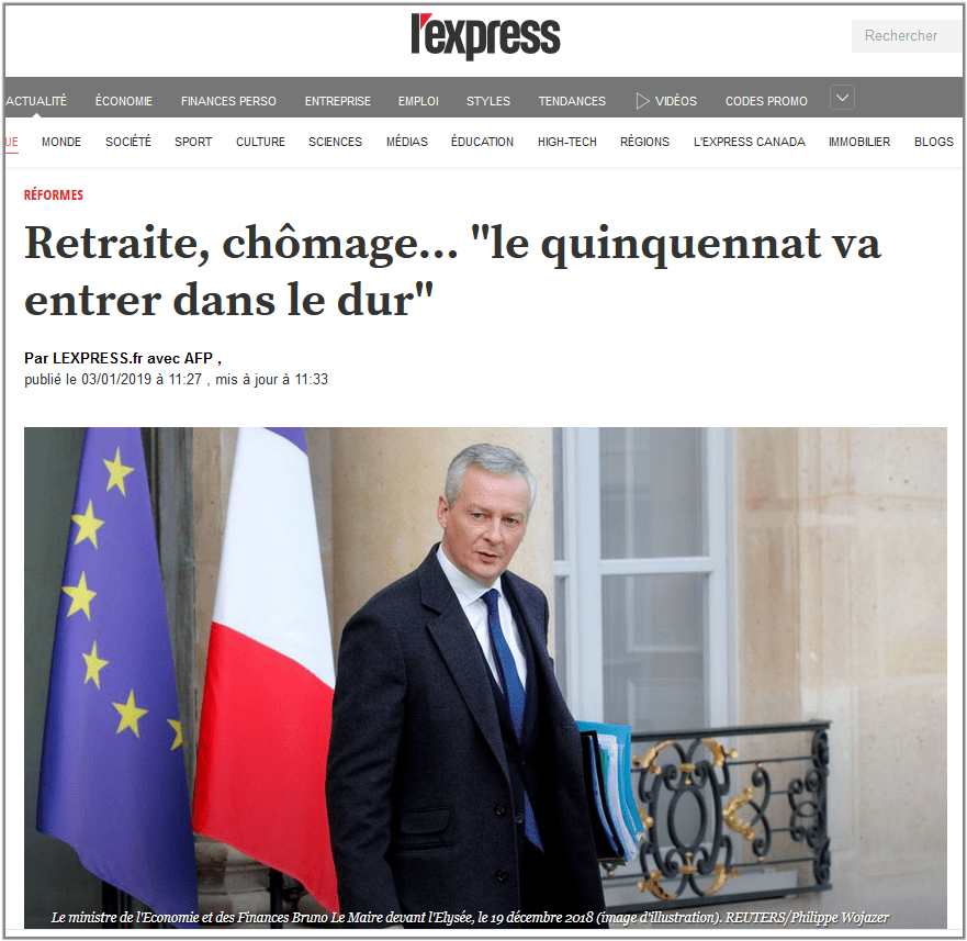 Ce 3 janvier 2019, le ministre de l’Économie Bruno Le Maire a affirmé tout de go sur France Inter que « le quinquennat entre, à partir de maintenant, dans le dur ». À savoir que les réformes vont pleuvoir contre les retraités, les chômeurs et les employés des services publics… ( Source : https://www.lexpress.fr/actualite/politique/retraite-chomage-le-quinquennat-va-entrer-dans-le-dur_2055658.html et https://twitter.com/franceinter/status/1080752840816189441 )