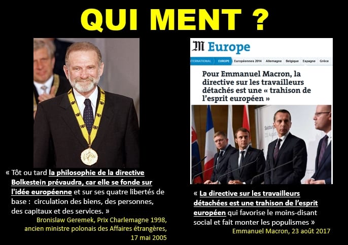 En d’autres termes, il ne faut pas avoir la naïveté de croire que Macron – pas plus que quiconque – ait le pouvoir de négocier la fin du système des travailleurs détachés, puisque le principe même de ce système est consubstantiel au marché unique européen.