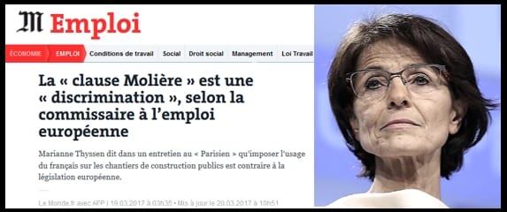 Bien évidemment, la réalité a vite rattrapé nos grands penseurs, lorsqu’un commissaire garde-chiourme s’en est mêlé. En l’occurrence, Marianne Thyssen, commissaire belge à l’Emploi, qui a jugé, le 19 mars 2017, que la « clause Molière » était une « discrimination », donc contraire aux traités européens.