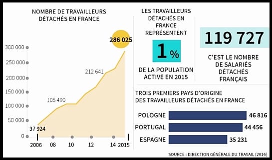 Comme le révèlent les statistiques officielles de la Direction générale du Travail, on est passé de 37 000 travailleurs européens « détachés » en France en 2006, à 286 000 en 2015, et probablement à plus de 300 000 cette année. Soit une multiplication par 8 en dix ans.