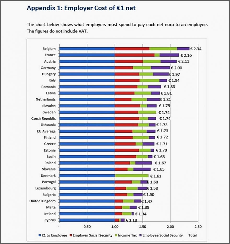 Force est de constater que les écarts de coûts salariaux entre les pays de l’UE sont loin d’être négligeables : ils vont du simple au double depuis Chypre – où les coûts salariaux sont les plus bas – jusqu’à la Belgique – où ils sont les plus élevés :