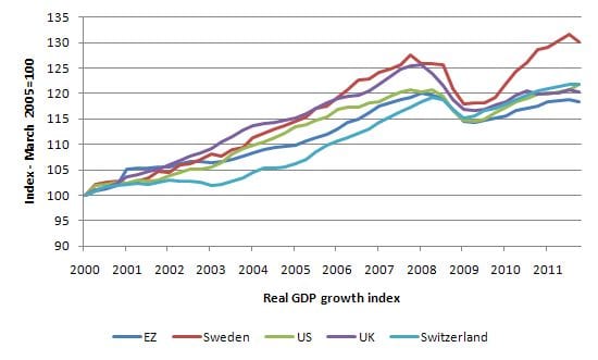 À titre de complément, je joins ci-après deux graphiques qui montrent comment a évolué le PIB de la Suède par rapport à celui des principaux pays occidentaux, et notamment par rapport à ceux de la zone euro :