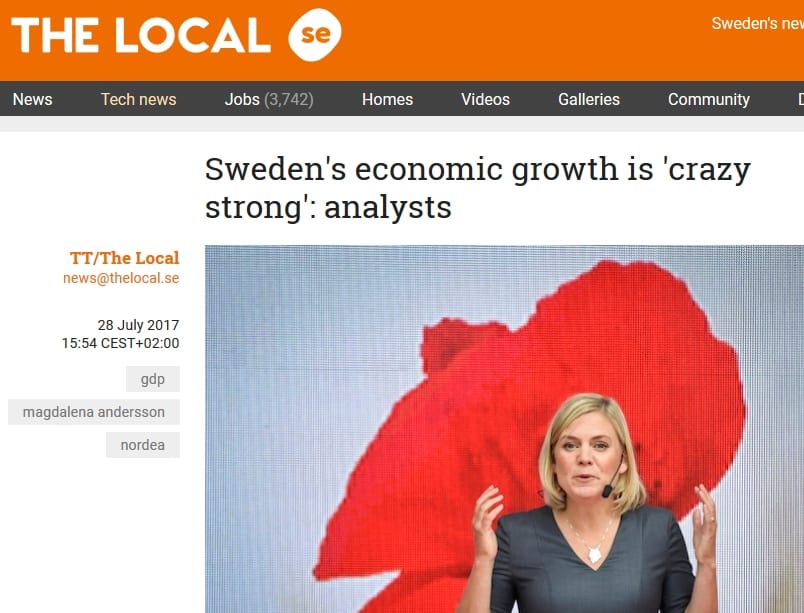 Comme le révèle ci-dessous un média suédois en langue anglaise, les dernières statistiques économiques suédoises parues le 28 juillet 2017 viennent par exemple de conduire les analystes à estimer que la croissance du PIB de la Suède est devenue « follement élevée ».