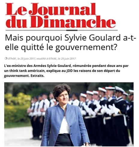 Scandale dans le scandale : le JDD du 25 juin 2017 révèle que Sylvie Goulard a quitté le gouvernement par peur de nouvelles révélations : avant de devenir ministre des armées, elle s’était fait payer – pendant plus de 2 ans – 10 000 dollars par mois par un « think tank » américain (en plus de sa rémunération de députée européenne)….