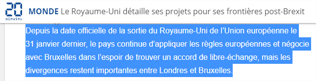 On peut lire dans l’article du gouvernement que « La sortie du Royaume-Uni de l’Union européenne entraînera des changements importants à la fin de la période de transition (1er février 2020 – 31 décembre 2020). »