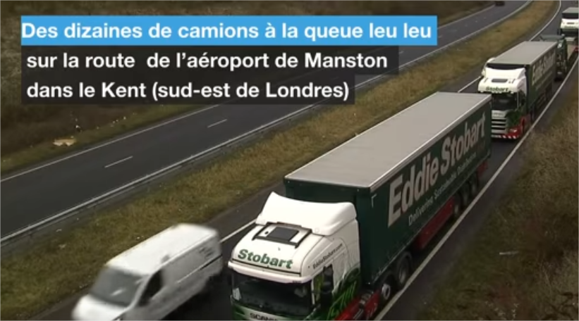 Pour illustrer son article LCI présente cette photo avec la légende « Les camions font la queue près de Douvres, en 2019. Celle-ci est créditée à Glyn KIRK / AFP.