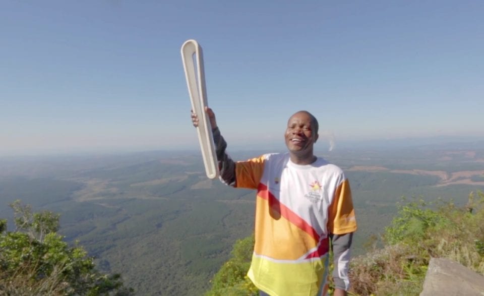 En Afrique du sud du 16 au 20 mai 2017 – Josia Thugwane, qui brandit ici le Queen’s Baton, fut le premier Sud-Africain noir de l’histoire à remporter une médialle d’or pour son pays. C’était en 1996 à Atlanta, au moment où prenait fin le régime d’apartheid. Le Queen’s Baton se veut le symbole d’une humanité réconciliée, toutes ethnies confondues.L’Afrique du sud a été l’étape finale du parcours en Afrique du Queen’s Baton pour les Jeux du Commonwealth 2018 ; le relais a ensuite été transmis au continent américain, dans les îles des Caraïbes