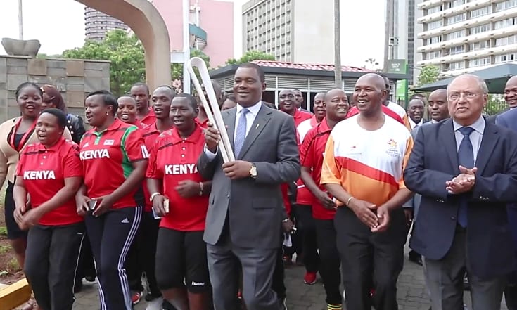 Au Kenya du 6 au 8 avril 2017. Le « Queen’s Baton » est ici relayé par un membre du gouvernement de Nairobi, en présence de l’ambassadeur du Royaume-Uni à droite de la photo.